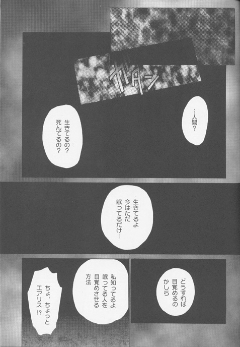 is he alive? is he dead? He's alive. He's only sleeping just now... Aeris: I wonder what I should do to wake him up... I know the way to make sleeping people wake up... He-hey, Aeris?!