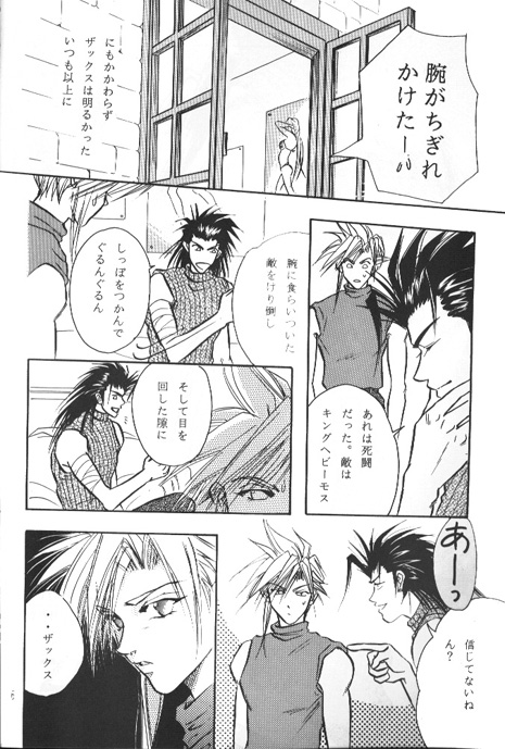 Zack: My arm was being torn off! But in spite of that, Zack was more cheerful than usual. Zack: That was a life and death struggle. The enemy was a King Behemoth. I kicked the enemy that was biting onto my arm. I grabbed its tail and spun it around! Then it got dizzy, and there was an opening. Ahhh, you don't believe me, do you? Cloud: ...Zack... |