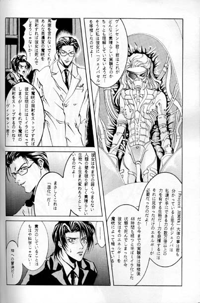 in her! I think you know the main points of Project JENOVA, but Jenova is a life form that has power 10,000-fold our own, power that we can harness. To demonstrate this power we needed an offset amount of energy! So, in the experiments up to this point, 48 hours after the transplant, she is halfway mummified. As things stand now, she has died, but now that energy, drawn from the Makou, is repairing her... Vincent: Don't talk such nonsense! If you irradiate her with such a high concentration of Makou, won't she die? Hojo: If I stop the irradiation now, tomorrow she'll
