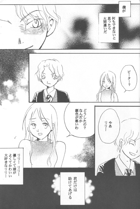 If you're thinking I can't do anything, you're badly mistaken. Lily: Peter? Peter: Hey, Lily... Lily: What's wrong? You don't look so well. Lily, Lily. Nice, smart, cute... dear Lily. You, alone, I will spare.