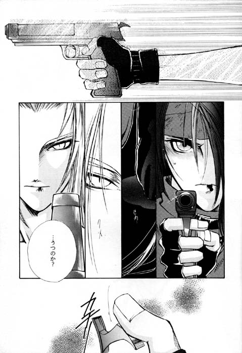 [sound effect: "jichi" or "jiwa" (glare? I can barely read this, even in the book itself..)] [sound effect: "kusu" (a smirk)] Sephiroth: ...You're going to shoot me? [sound effect: "kachiri" (the hammer of the gun)] |