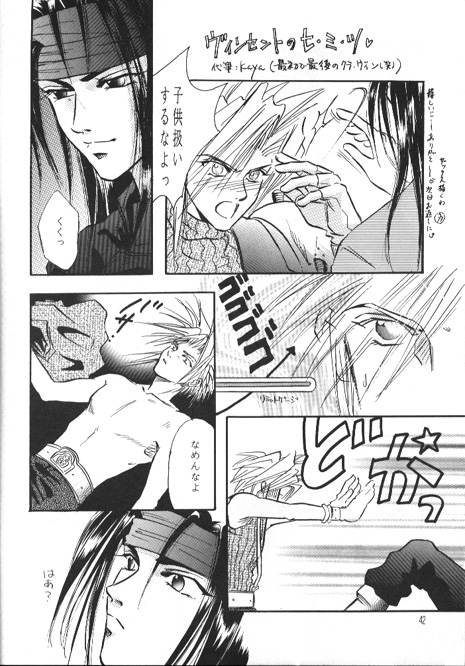 *smiles*) Cloud: Don't treat me like a child! Vincent: *chuckling* [sound effect: "gogogogo" (Limit gauge, and tension, rising)] [sound effect: "basa" (the shirt being tossed)] Cloud: Don't make fun of me. [sound effect: "doka" (an impact)] Vincent: *gasps in surprise* |